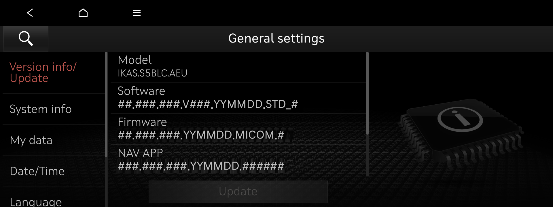 Wählen Sie „Version info/Update“ auf dem General settings-Bildschirm und dann die Schaltfläche „Update“ aus, um mit der Aktualisierung fortzufahren