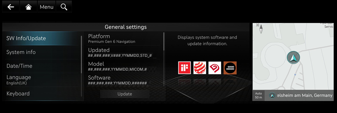 Wählen Sie „SW Info/Update“ auf dem General settings-Bildschirm und dann die Schaltfläche „Update“ aus, um mit der Aktualisierung fortzufahren