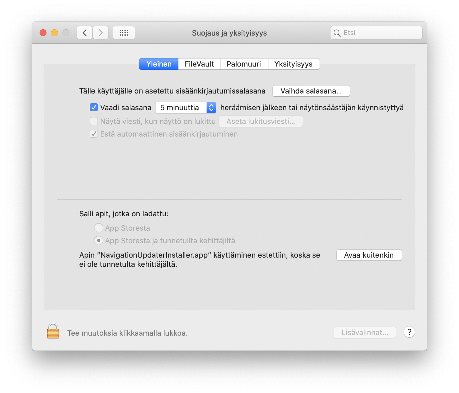 Napsauta kohdassa [Suojaus ja yksityisyys] > [Yleiset] > [Salli sovellukset, jotka on ladattu osoitteesta] painiketta ”Avaa joka tapauksessa”.