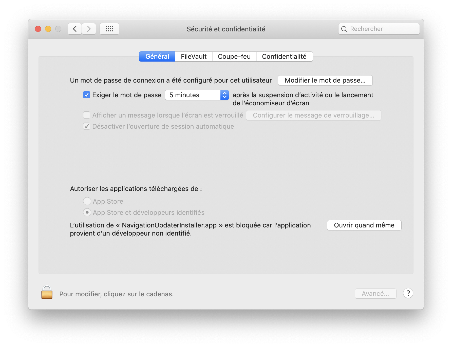 Dans [Sécurité et confidentialité] > [Général] > [Autoriser les applications téléchargées de], cliquez sur « Ouvrir quand même ».