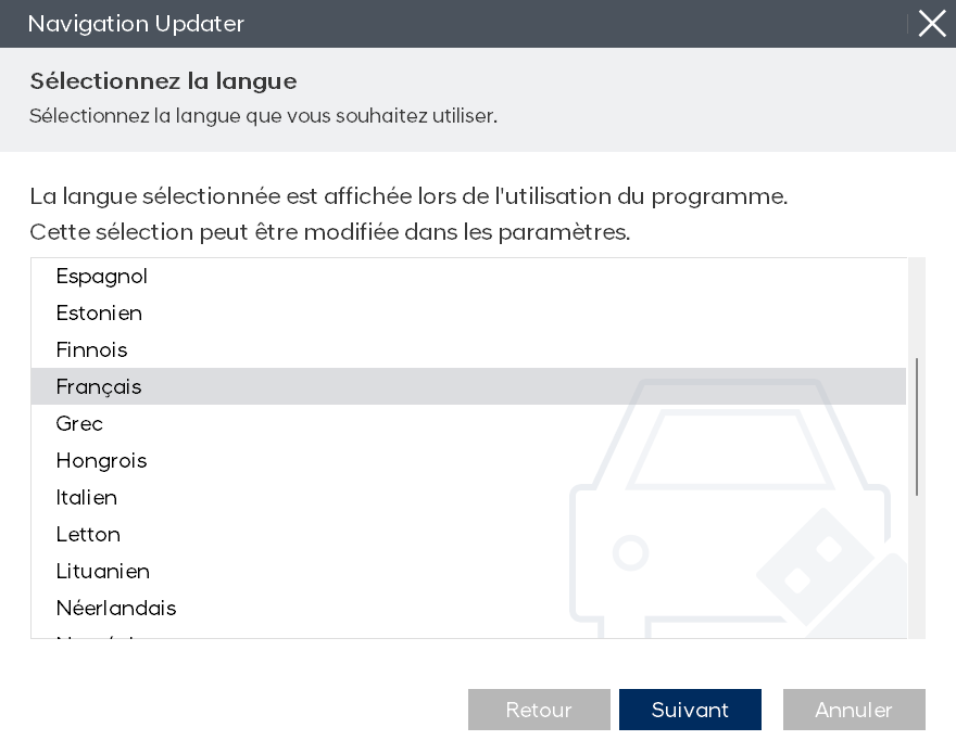 Sélectionnez la langue que vous souhaitez utiliser dans le programme, puis cliquez sur « Suivant ».