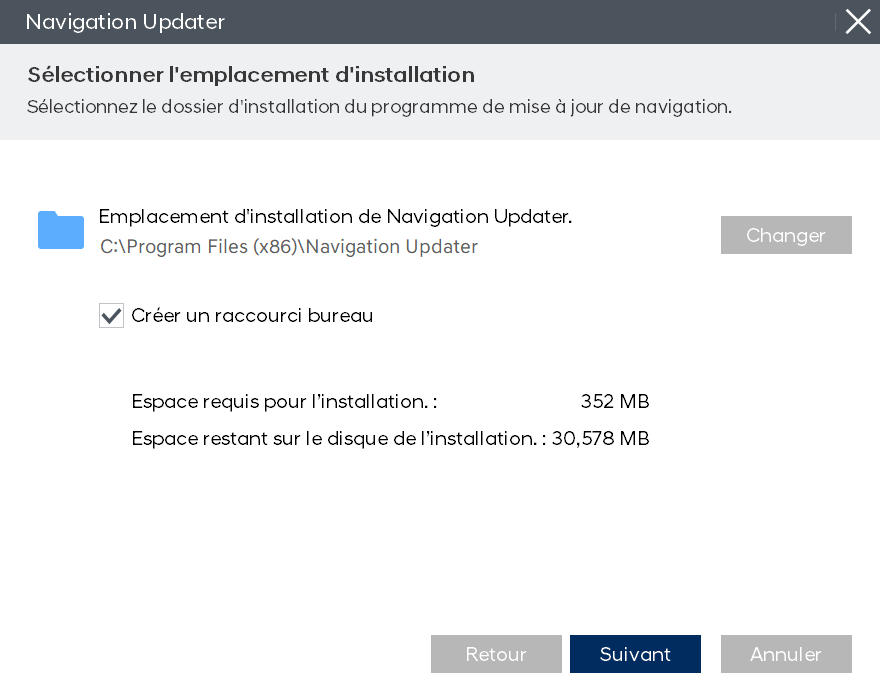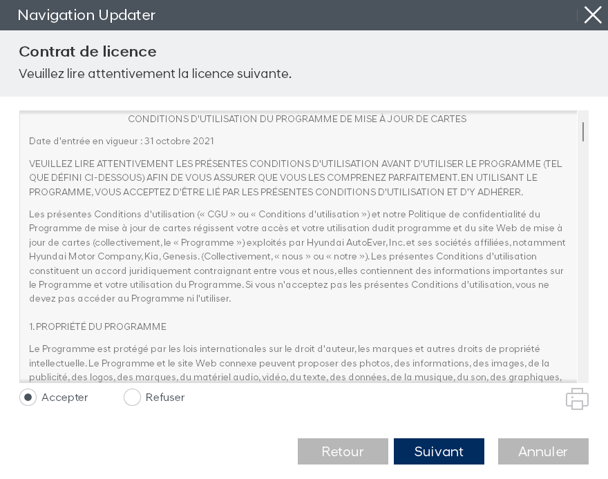 Une fois l’installation du programme prête, lisez les termes du contrat de licence et les droits d’utilisation du logiciel de mise à jour de navigation, cochez le bouton de confirmation et d’acceptation, puis cliquez sur « Suivant ».