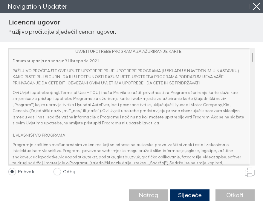 Nakon što je instalacija programa spremna, pregledajte uvjete licencnog ugovora i prava korištenja softvera za ažuriranje navigacije, provjerite gumb za potvrdu i ugovor, a zatim kliknite gumb „Dalje”.