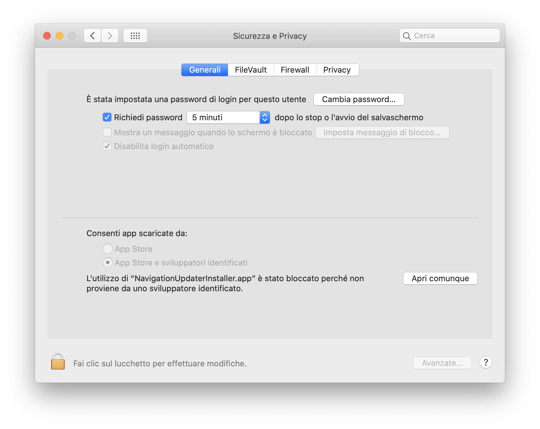 Passa a Preferenze di Sistema > [Sicurezza e Privacy] e fai clic su questa voce.