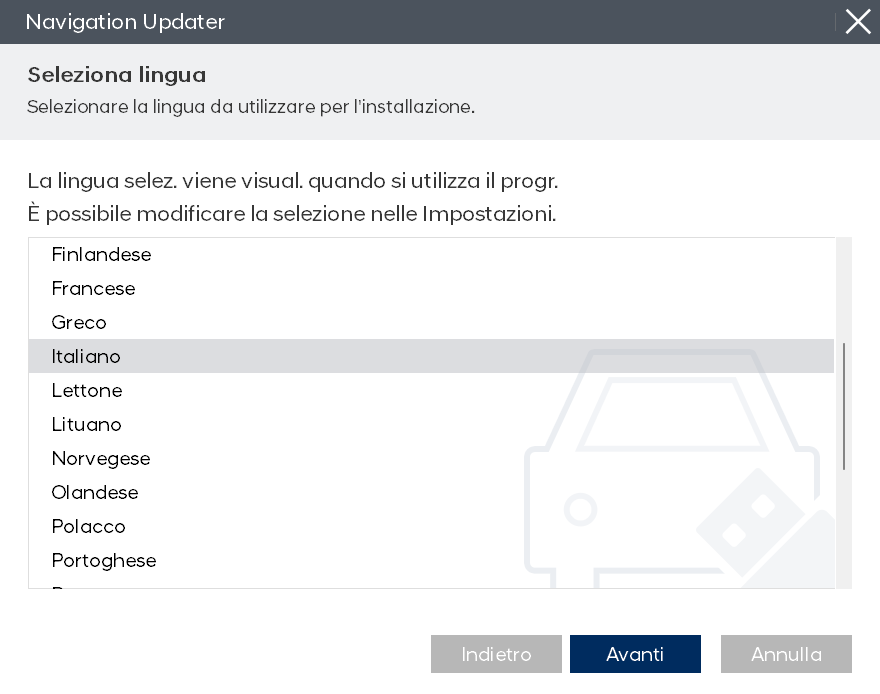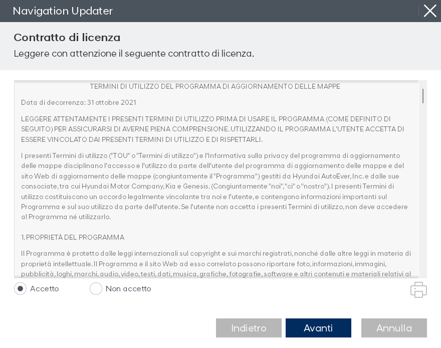 Una volta completata l'installazione del programma, leggi i termini del contratto di licenza e i diritti di utilizzo del software di aggiornamento della navigazione, seleziona il tasto di conferma e accettazione, quindi fai clic sul tasto “Avanti”.
