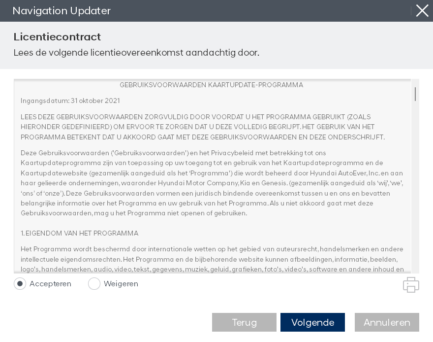 Lees de voorwaarden van de licentieovereenkomst en de gebruiksrechten van de navigatie-updatesoftware zodra de installatie van het programma is voltooid, controleer de knop voor bevestiging en akkoord en klik vervolgens op de knop 'Volgende'.