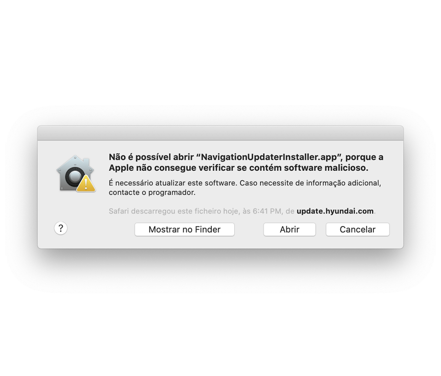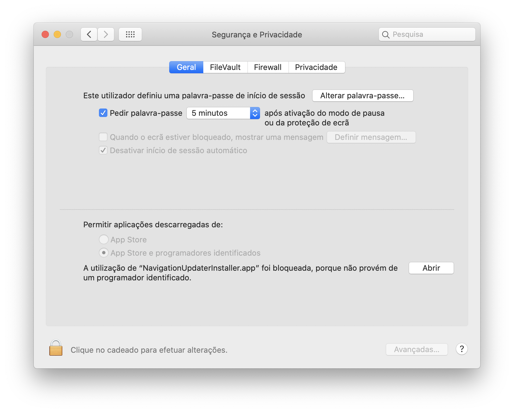Em [Segurança e Privacidade] > [Geral] > [Permitir aplicações transferidas de], clique no botão "Abrir mesmo assim".