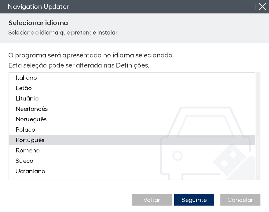 Quando a instalação estiver pronta, reveja os termos do contrato de licença e os direitos de utilização do software de atualização de navegação, assinale a caixa de confirmação e concordância e clique em "Seguinte".