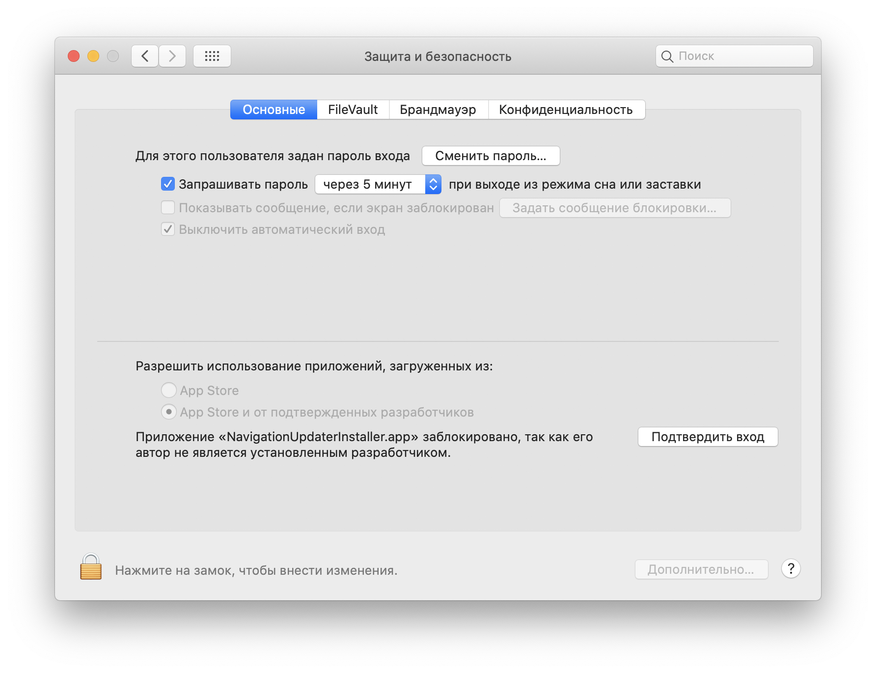 В меню [Безопасность и конфиденциальность] > [Общее] > [Разрешить приложения, скачанные с], щёлкните кнопку «Открыть в любом случае».