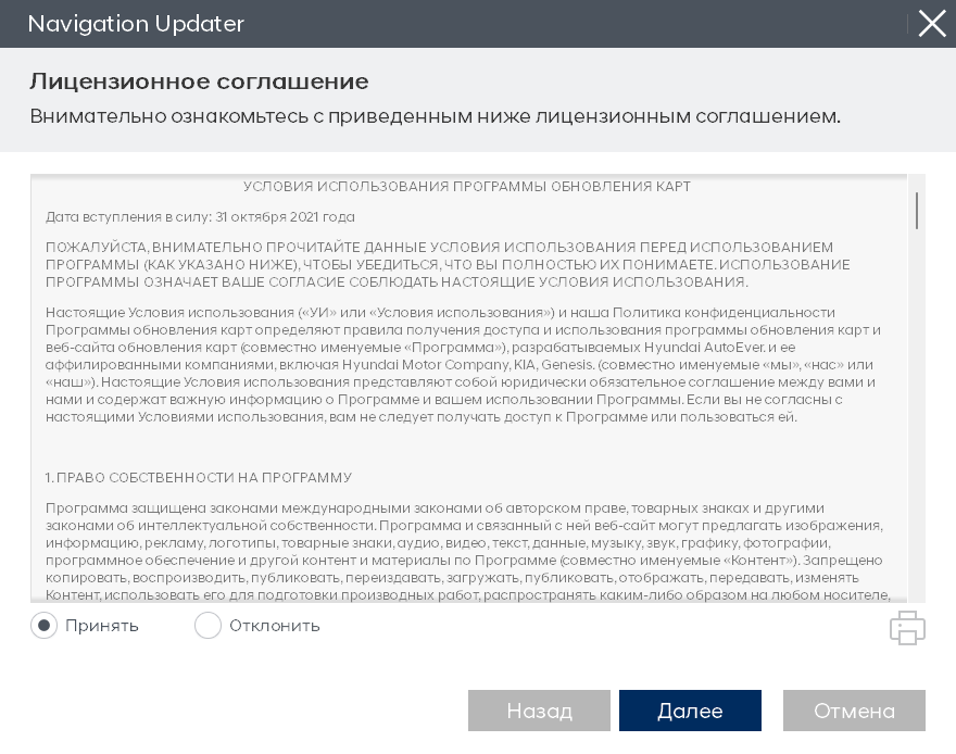 После завершения установки программы ознакомьтесь с условиями лицензионного соглашения и правами использования ПО для обновления навигатора, отметьте кнопку подтверждения и согласия, после чего щёлкните кнопку «Далее».