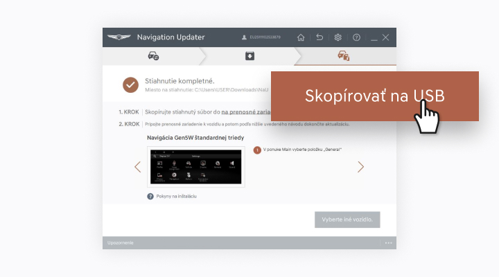 "Vezmite prenosné zariadenie (USB) do svojho vozidla a pokračujte v procese aktualizácie.Pokyny sú uvedené nižšie."