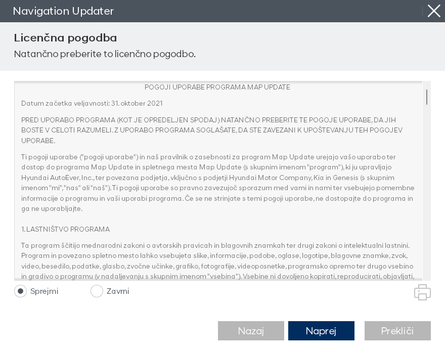 Ko je namestitev programa pripravljena, preglejte pogoje licenčne pogodbe in pravice uporabe programske opreme za posodobitev navigacije, odkljukajte gumb za potrditev in strinjanje ter nato kliknite gumb »Naprej«.