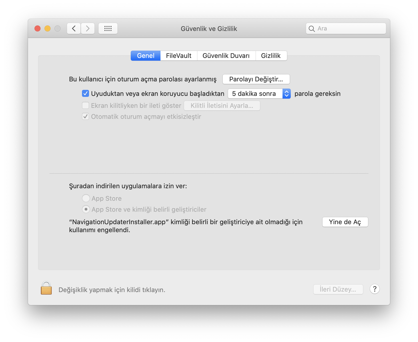 [Güvenlik ve Gizlilik] > [Genel] > [Uygulamaların indirilmesine izin ver] bölümünde "Yine de Aç" düğmesine tıklayın.