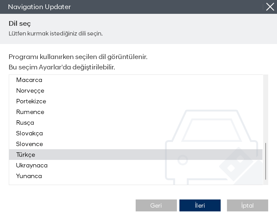 Program kurulumu hazır olduğunda, lisans sözleşmesinin şartlarını ve navigasyon güncelleme yazılımı kullanım haklarını inceleyin, onay ve sözleşme düğmesini işaretleyin ve ardından "İleri" düğmesine tıklayın.