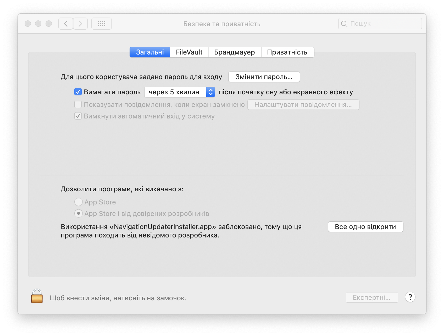 У розділі [Security & Privacy] > [General] > [Allow apps downloaded from], натисніть кнопку «Однаково відкрити».