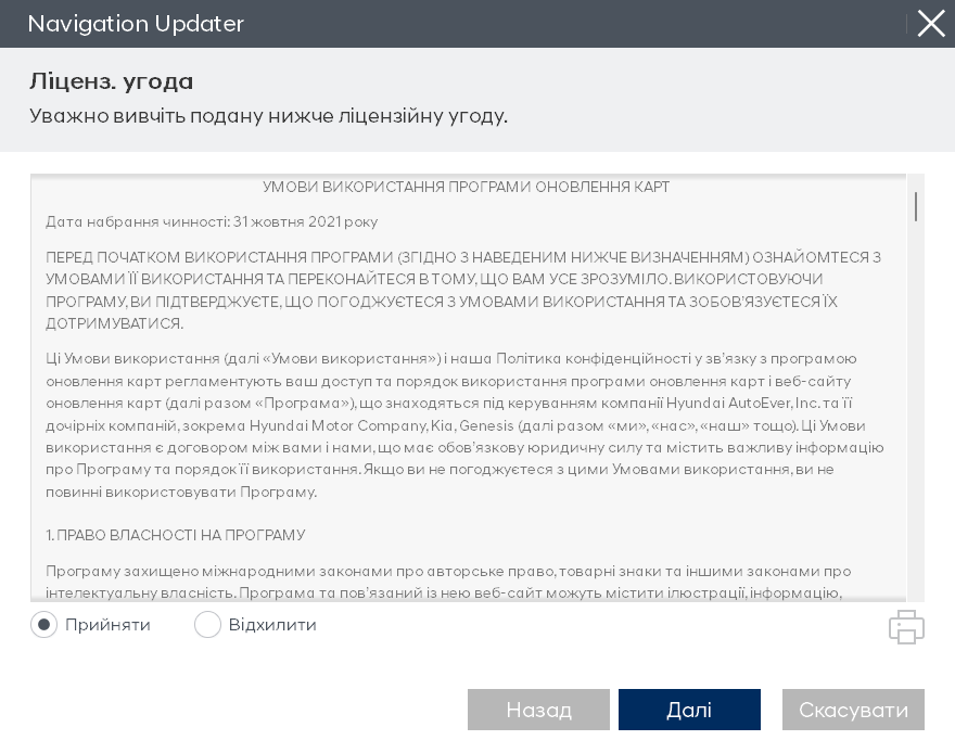 Коли програма буде готова до встановлення, ознайомтеся з умовами ліцензійної угоди та правами на використання програмного забезпечення для оновлення навігації, поставте галочку підтвердження та згоди, а потім натисніть кнопку «Далі».