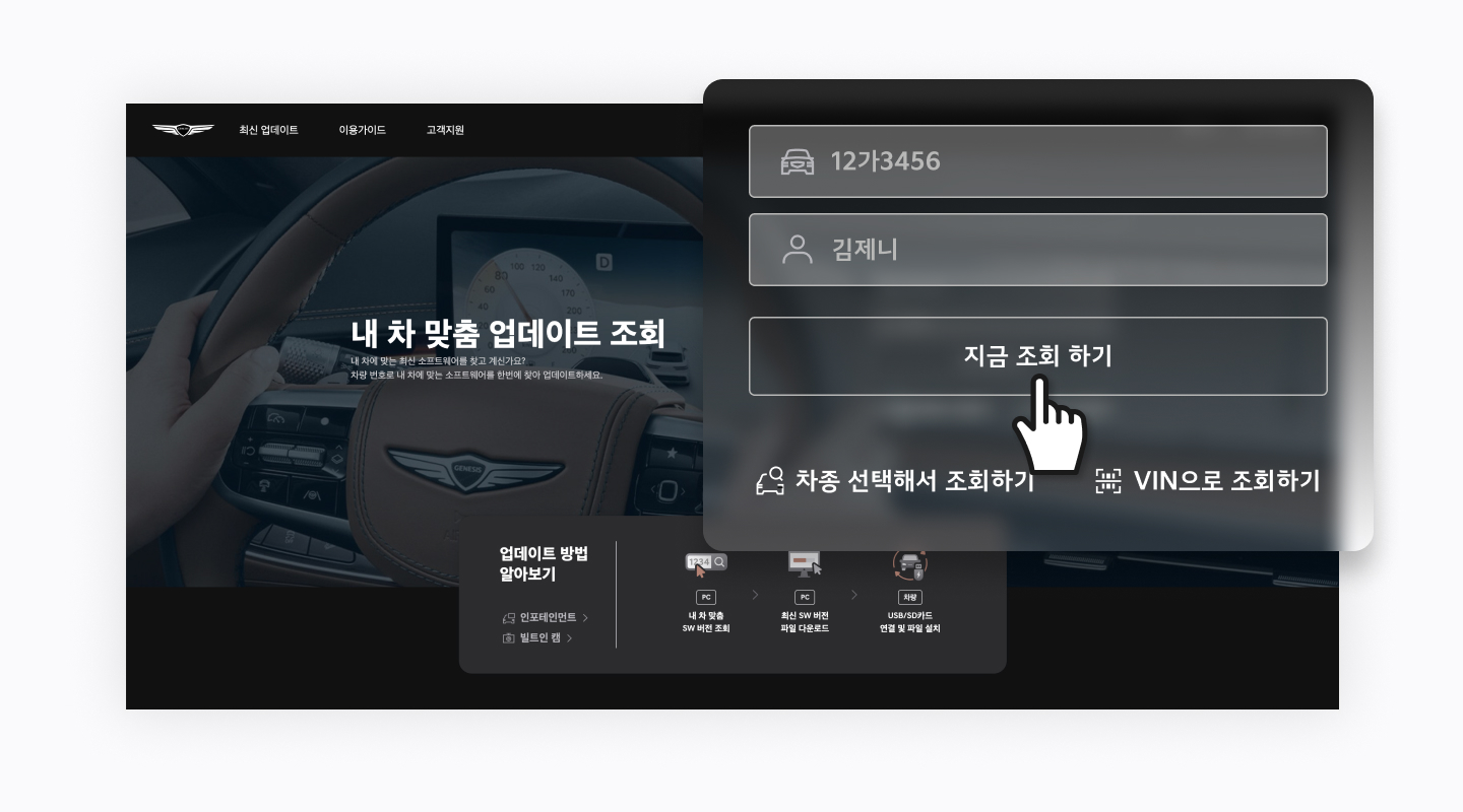- 홈 화면 [내 차 맞춤 업데이트 조회]를 이용해 내 차에 맞는 최신 소프트웨어를 조회합니다.