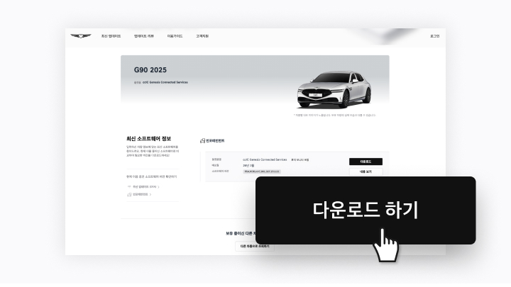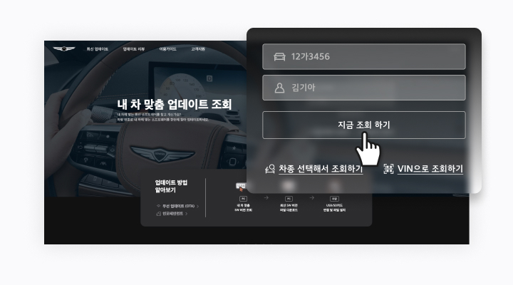 - 홈 화면 [내 차 맞춤 업데이트 조회]를 이용해 내 차에 맞는 최신 소프트웨어를 조회합니다.
