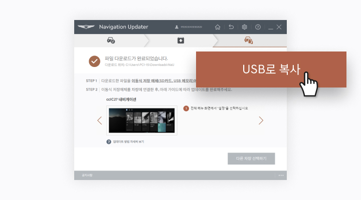 - 다운로드 완료 시, [USB로 복사]를 선택하여 업데이트 파일을 이동식 저장소로 복사합니다.최종 저장 위치를 이동식 저장장치로 설정한 경우 본 단계를 생략합니다.