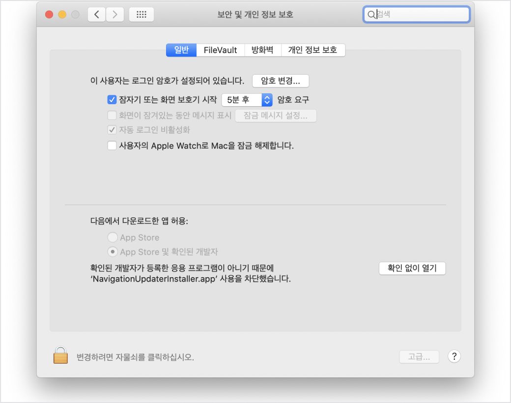 [보안 및 개인 정보 보호] > [일반] > [다음에서 다운로드한 앱 허용]에서 "확인 없이 열기" 버튼을 클릭해주십시오