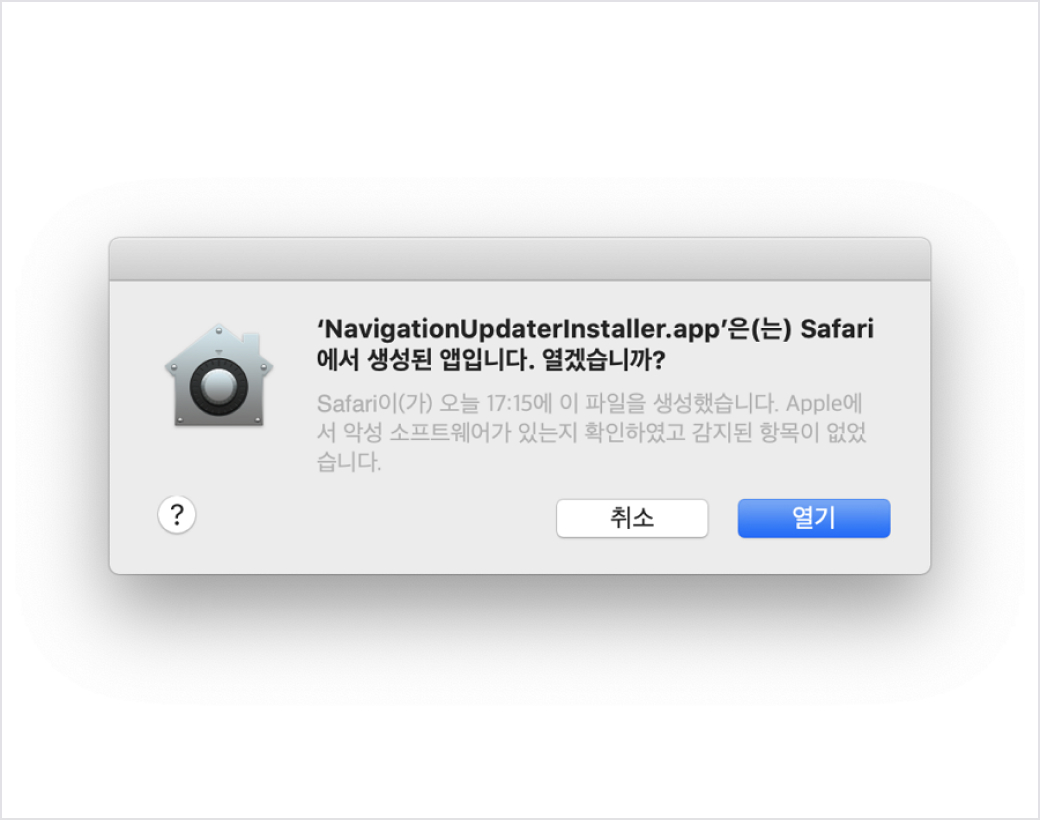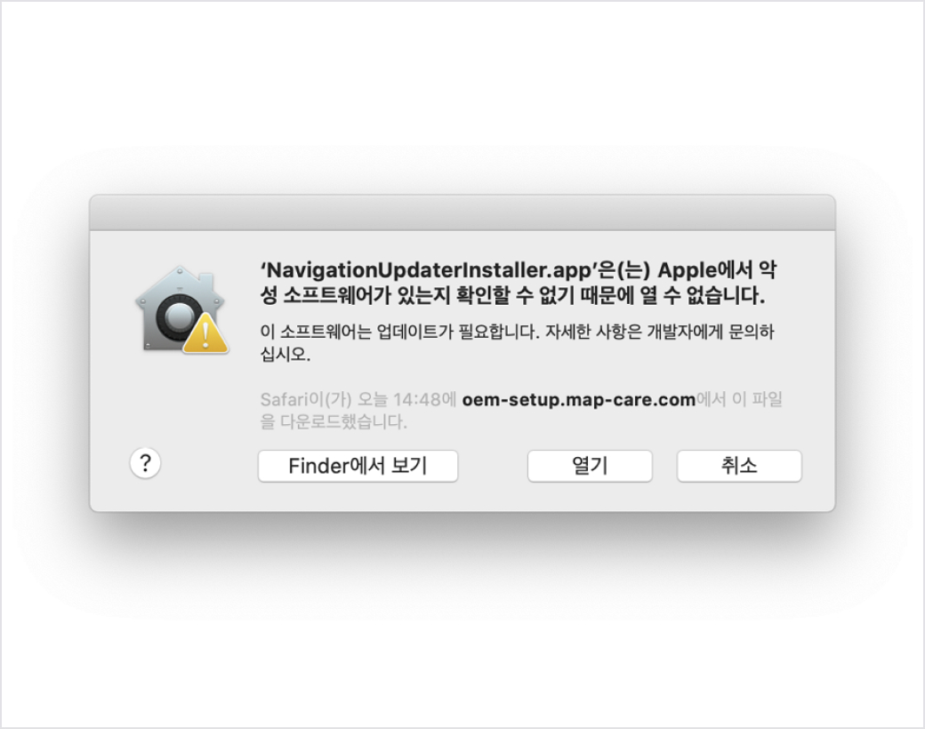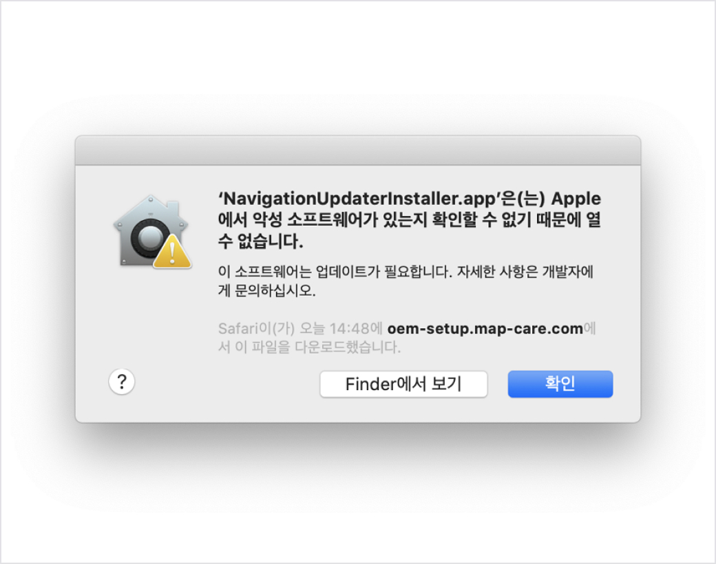 Navigation Updater 설치 시, 확인되지 않은 개발자 앱 열기 팝업이 표시될 수 있습니다.