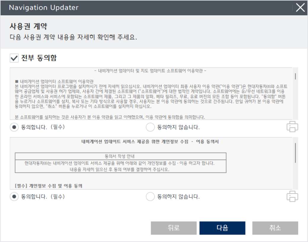 프로그램 설치가 준비되면, 사용권 계약의 조항과 내비게이션 업데이트 소프트웨어사용권에 대한 내용의 확인 및 동의 버튼을 체크하신 후 "다음" 버튼을 클릭해주십시오.