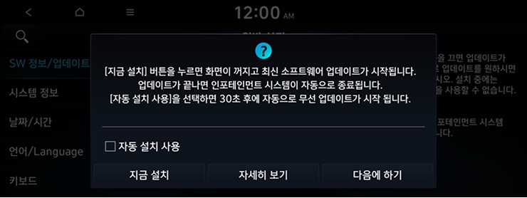 일반 설정 화면에서 "SW정보"탭을 선택하고, "업데이트"를 선택하면 업데이트가 진행됩니다