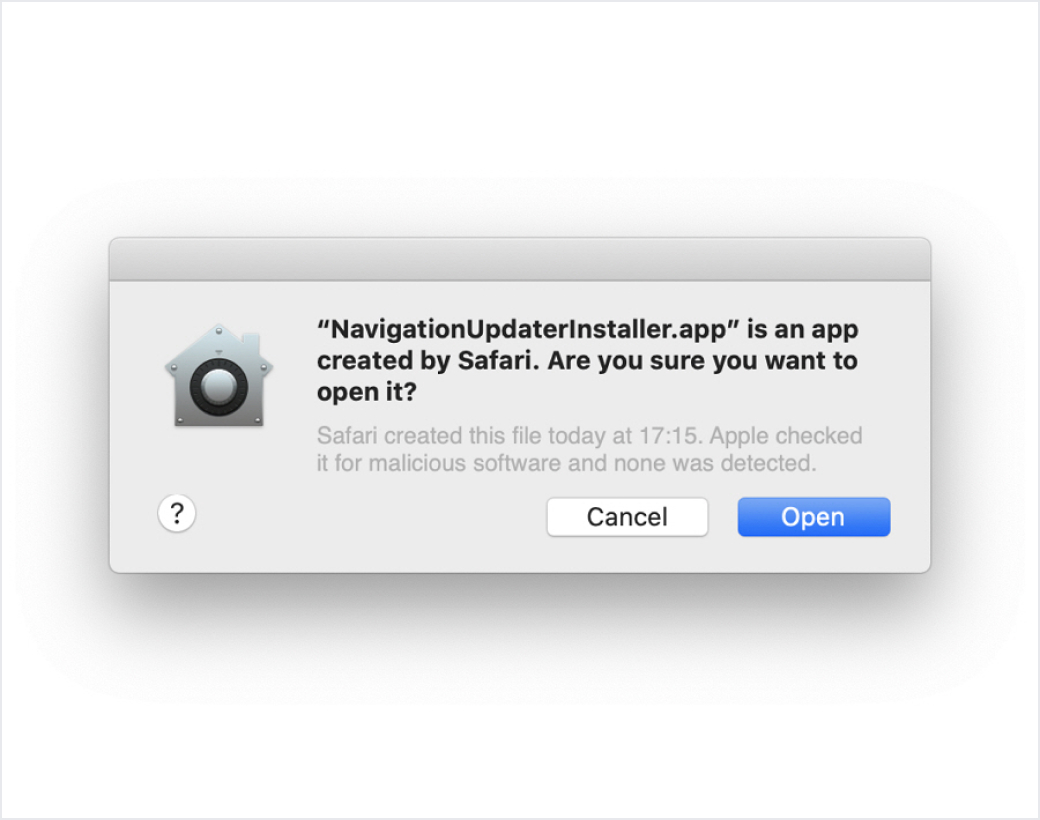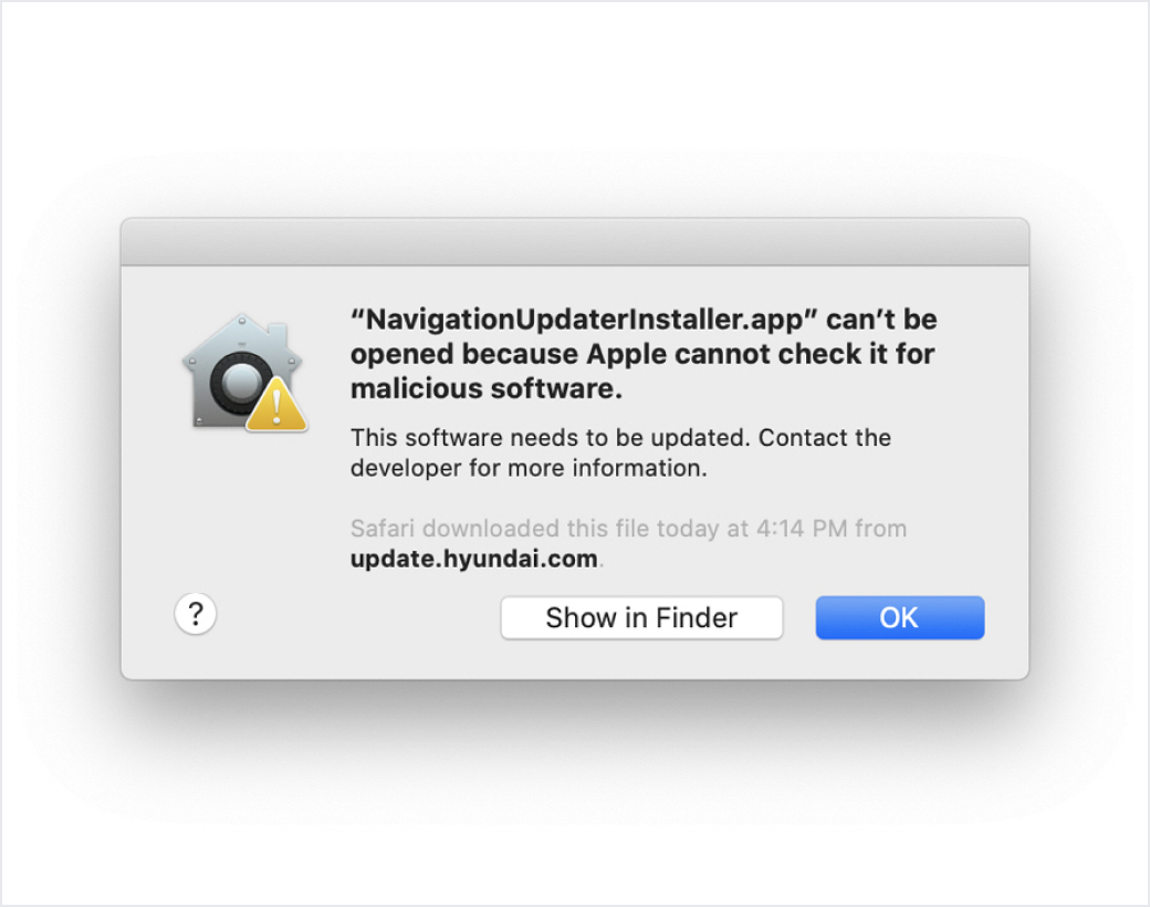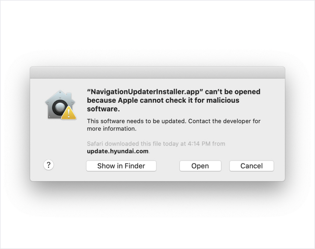 When installing Navigation Updater, a popup may appear indicating that the app is from an unidentified developer.